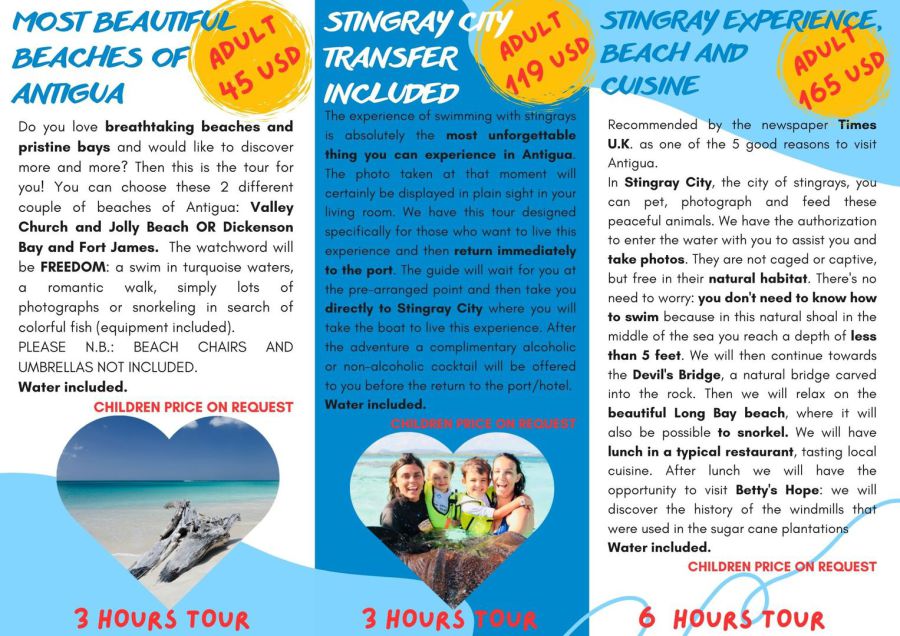 We work with the most famous tour operators in the island and we sell ALL THE BEST TOUR AND EXCURSIONS Antigua could offer.