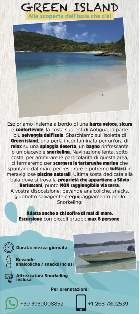 Esploriamo insieme a bordo di una barca veloce, sicura e confortevole, la costa sud-est di Antigua, la parte più selvaggia dell’isola. Sbarchiamo sull’isoletta di Green island, una perla incontaminata per un’ora di relax su una spiaggia deserta, un bagno rinfrescante o un piacevole snorkeling. Navigazione lenta, sotto costa, per ammirare le particolarità di questa area, ci fermeremo per scorgere le tartarughe marine che spuntano dal mare per respirare e potremo tuffarci in meravigliose piscine naturali. Ultima sosta dedicata alla baia dove si trova la proprietà che appartiene a Silvio Berlusconi, punto NON raggiungibile via terra.